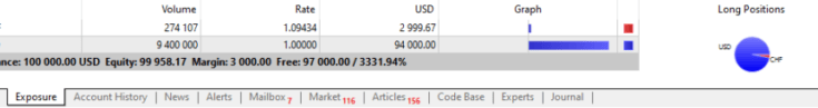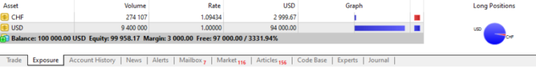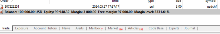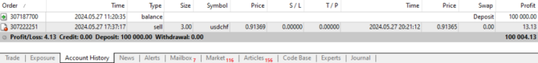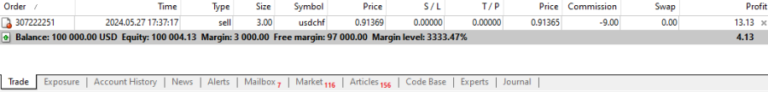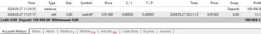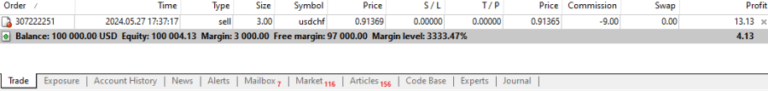 Una vez cerrado, tu trade dejará de aparecer en la pestaña «Trade», tu exposición cambiará, y verás el resultado en la pestaña «Account History».