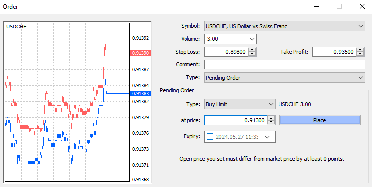 Pero si utilizas una orden «Limit» o límite («Pending Order»), tendrás que cargar algunos datos más.