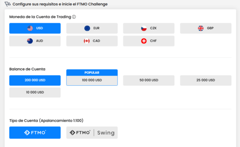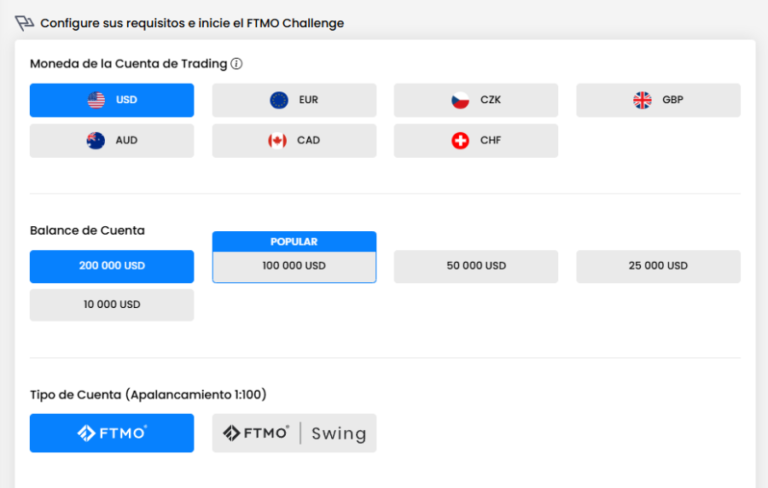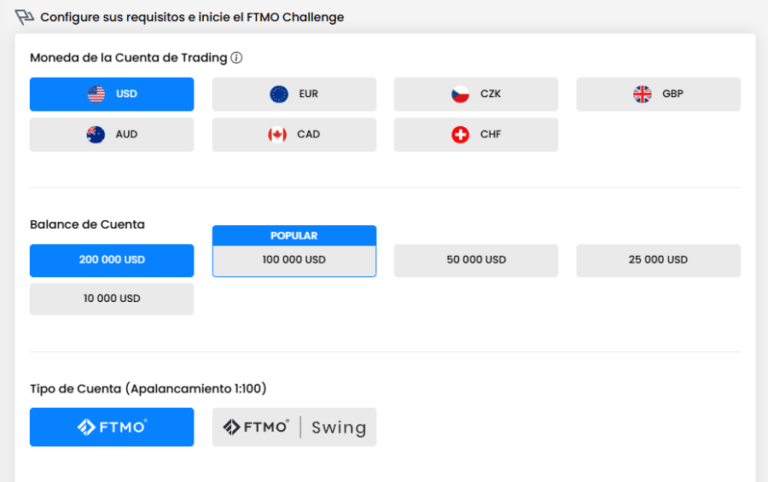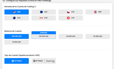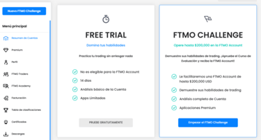 En este caso, vas a seleccionar la opción FTMO Challenge para iniciar el proceso de tu nuevo desafío.
