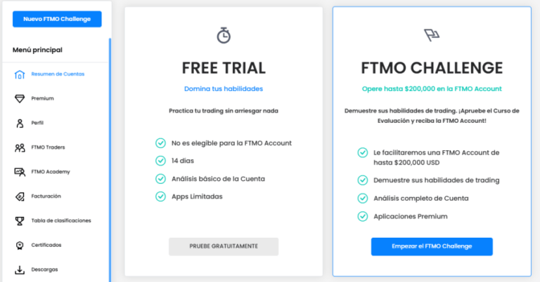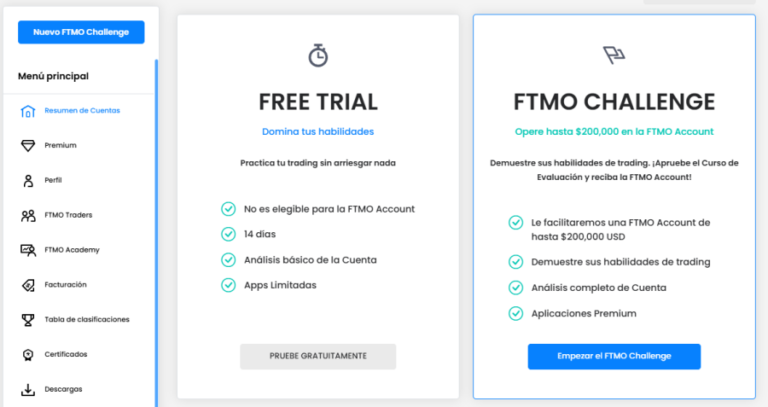 En la sección de «Resumen de cuentas» de FTMO tienes estas dos opciones: